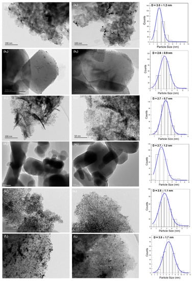 The TEM images and size distribution histograms of supported Au25 NCs catalysts after heat treatment were shown in Figure 4. The dark spots presented in images were defined as the gold particles. From the electronic photos, the gold particles were highly dispersed on various supports. The average particles sizes of gold were within 3 nm with narrow distributions in most of the catalysts, which are 3.0 ± 1.2, 2.6 ± 0.9, 2.7 ± 0.7, 2.7 ± 1.2, 2.7 ± 1.1 nm for the Au25/MgAl-300 (Figure 4a), Au25/MgO-300 (Figure 4b), Au25/ZnAl-300 (Figure 4c), Au25/ZnO-300 (Figure 4d) and Au25/Al2O3-300 (Figure 4e) catalysts, respectively. It meant the Au25 NCs could be stabilized on MgAl-HT, ZnAl-HT, MgO, ZnO, and Al2O3 supports, whereas the mean particle size of the Au25/SiO2-300 catalyst was about two times larger than that on others, on which the particle size of gold was 5.9 ± 1.7 nm (Figure 4f). The reason might be caused by the weak interaction between gold and the SiO2. In this situation, the gold NCs might grow to be the bigger ones on the surface without the anchor of the carrier. This led to an increased particle size of gold in Au25/SiO2-300. The supposition could be verified by high resolution TEM (HRTEM). The representative electronic images were displayed in Figure S3. From the photos, the gold particles on the Au25/SiO2-300 catalyst showed the round shape, yet, over the other catalysts, the gold particles were hexagonal or polygonal. The phenomenon revealed the fact that the gold particles weakly interacted with the supports would lead to a smooth interface, whereas the gold strongly interacted with the supports would result in an irregular shape [,]. Thus, the gold and the supports could share more terraces and steps, which facilitated the anchoring of gold on the surface [,]. Furthermore, by analyzing the direction of lattice fringes, there was obvious tropism between gold and the supports (Figure S3a–e), which further suggests the possibility of the strong interaction between gold and the support [,].