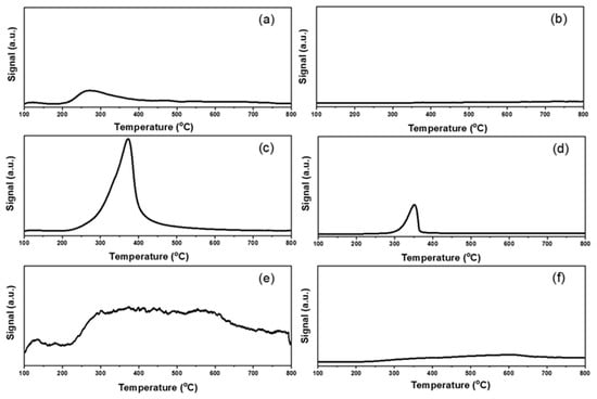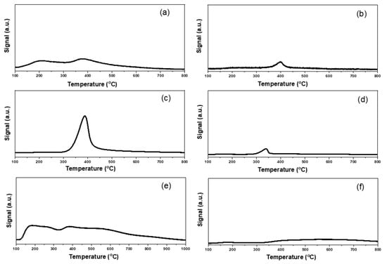 NH3-TPD profiles of different supported gold catalysts: (a) Au25/ZnAl-300; (b) Au25/ZnO-300; (c) Au25/MgAl-300; (d) Au25/MgO-300; (e) Au25/Al2O3-300; (f) Au25/SiO2-300.