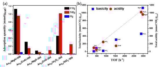(a) the comparison of adsorption quantities of CO2, NH3 and O2 over the different supported gold catalysts by pulse adsorption tests; (b) the relationship between TOF values with the total basicity and acidity over different supported gold catalysts.