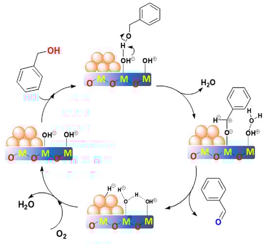 The proposed reaction mechanism could be divided into four steps. In the first step, the benzyl alcohol attacked the basic site of M–OHδ− on the supports. Then, the deprotonation by the hydroxyl group of the support occurred to form an alkoxide intermediate at the interface. Simultaneously, the molecule water was formed in the process. After that, the alkoxide intermediate proceeded with the coordination with the gold to form a metal-hydride species. Synchronously, the β-hydride was eliminated from the interface by the gold to produce the benzaldehyde. According to literature [,], this step might play a significant role in determining the selectivity of benzaldehyde. In addition, the process was expected to be the rate-determining step. This was why the small gold particles exhibited higher activity—because the coordinatively unsaturated gold atoms with smaller sizes were more active for the cleavage of the C–H bond. However, when the particle sizes were within a small range, the acid-base property dominated the reaction rate instead of the particle size. In the last step, the reaction underwent a rapid oxidation of the metal-hydride specie by oxygen to form the water, which promoted by the acid site of the support. Then, the catalysts recovered at the initial metallic state, thereby to complete the catalytic cycle. For the Au25/MgAl-300 catalyst, we also examined the recyclability for the oxidant of benzyl alcohol. As shown in Figure S7, the conversion of benzyl alcohol decreased from 87% to 19% after reusing five times. This means that the Au25/MgAl-300 catalyst was not very stable in the reaction. The TEM results of Au25/MgAl-300 catalyst after reusing three times indicated that the particle sizes of gold increased from 3.0 nm (Figure 4a) to 4.5 nm (Figure S8), and agglomeration appeared in part of the catalyst, which might be deemed as a key point for the reduction of catalytic performance.