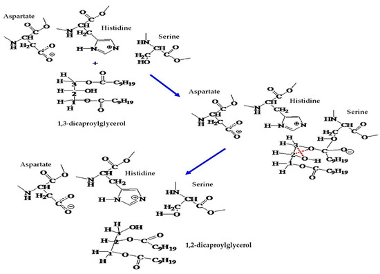 Spontaneous isomerization from 1,2-DAG to 1,3-DAG and from 2-MAG to 1-MAG has been described by Laszlo et al. [55]. The formation of an intermediary, called the ketal intermediary, was proposed to explain the migration from 1,2-DAG to 1,3-DAG. This mechanism has been proposed for the liquid state and the formation of this intermediate could be catalyzed by acidic or basic groups, or it could even occur in an uncatalyzed form in the reaction medium. A similar intermediary is generated during the coordination of the lipase with the diglyceride. In this case, we should consider the structure of the active site and the location of the compound in its vicinity. The structure of the Rhizomucor miehei lipase (RML) was obtained from Protein Data Bank 3tlg [56]. This lipase has in its catalytic triad a Serine residue at position 144, Histidine at position 257, and Aspartate at position 203, spatially located in a specific way. Figure 1 shows the coordination of 1,3-dicaproylglycerol with the Serine residue of the catalytic triad.