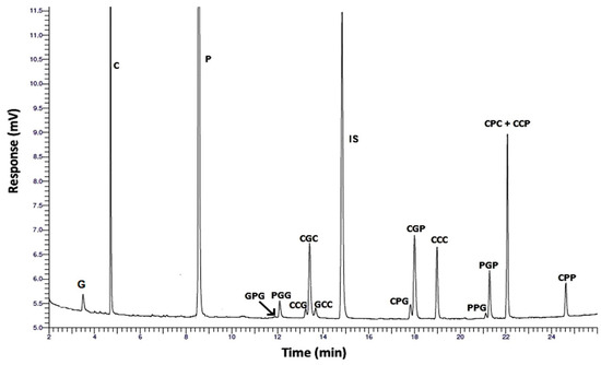 In previous studies [54,57], we reported the ability of the capillary column used in this work to identify isomers as a function of the position of the hydroxyl group. Thus, it was possible to identify and quantify isomers of mono- and diglycerides, but not triglyceride isomers. To identify the triglyceride isomers, it was necessary to perform a regioselective hydrolysis with porcine pancreas lipase.