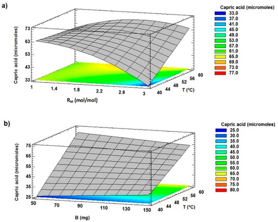 The surface response graphs presented in Figure 7 show the effect of the variables on the generation of capric acid (indirectly on the hydrolysis reaction). The plots were obtained from Equation (5), which adjusts this response with a R2 = 92.6%.