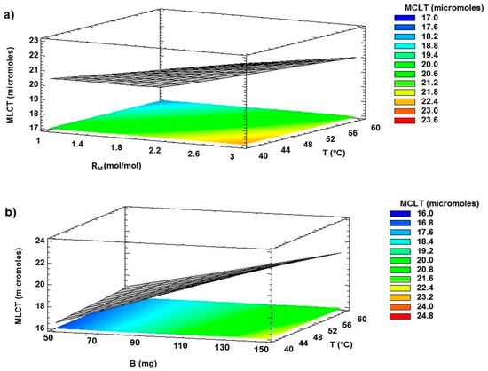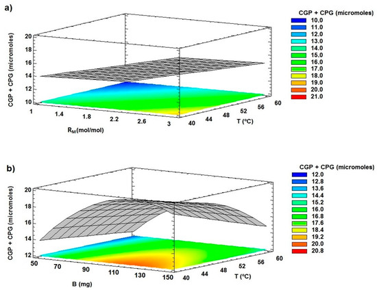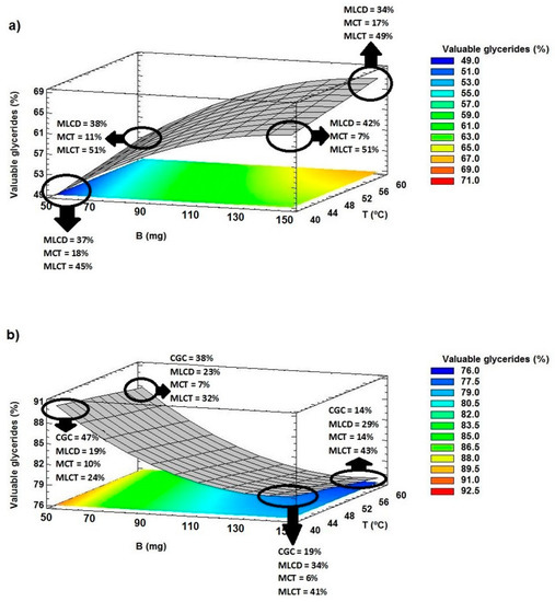 Figure 8 shows surface plots for this response obtained from Equation (8), which correlates the generation of the diglycerides with the evaluated factors with a R2 = 95.9%.