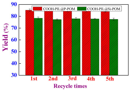 Figure 1b shows the infrared data of two ionic self-assemblies and carboxylic functionalized PIL. The absorption bonds appeared at 1725, 1630, 1470, and 1140 cm−1, which could be assigned to the vibrations of C=O groups of ester and carboxylic moiety, C-N stretching, and C-O vibration, respectively, suggesting the polycationic frameworks was introduced successfully. In the wavenumber regions of 750–1200 cm−1, PW12O40−3 gave four characteristic bands at 1080, 978, 896, and 816 cm−1. SiW12O40−4 gave five characteristic bands at 1015, 972, 920, 882, and 796 cm−1. These facts combined with XRD results prove that the basic structure and geometry of the Keggin type POM anion are well-preserved. The vibration bands of POM anion in two ionic self–assemblies are slightly shifted in comparison with free POM, which result from the strong ionic interaction between the polymeric quaternary ammonium cation and POM anion. In addition, compared with the fresh ionic self-assemblies, there is no notable difference shown in the FT-IR spectrum of the used ionic self-assemblies after five recycles, indicating the highly chemical and structural stability of two ionic self-assemblies.