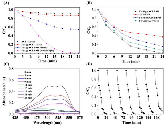 2.4. Comparison between the FeCit-ACFs/PMS/Visible Light and FeAlg-ACFs/PMS/Visible Light Systems