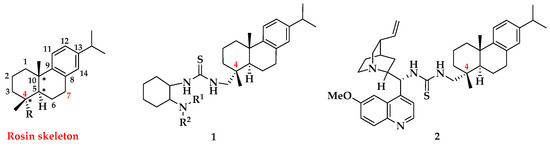 Rosin-derived bifunctional thiourea organocatalysts, originated from the abundantly available natural rosin, were revealed to be highly efficient for some catalytic asymmetric reactions, including Aza-Henry [28], Mannich reaction [29,30], Aldol reaction [31,32], Michael addition [33,34,35,36], and Friedel-Crafts alkylation [37]. The thiourea moiety of those organocatalysts is usually introduced at position C-4 of rosin skeleton, while the tertiary amine moiety is either 1,2-diaminocyclohexane 1 or cinchona alkaloid 2 (Figure 1). In addition to thiourea, squaramide is also a good hydrogen-bonding donor and has been successfully applied to facilitate various asymmetric transformations [38,39,40,41,42,43]. Recently, we have developed several bifunctional squaramide catalysts at position C-4 or C-7 of rosin scaffold, which exhibited excellent enantioselectivities in asymmetric catalytic 1,3-dipolar cycloaddition reactions [44] and Michael/cyclization cascade reactions [45]. However, to the best of our knowledge, rosin-derived chiral squaramides have not been applied for the enantioselective Michael reaction of malononitrile and chalcones. As our ongoing interest in organocatalysis of rosin-derived catalysts, we herein reported the results from the asymmetric Michael addition of malononitrile with chalcones catalyzed by rosin-derived bifunctional squaramide organocatalysts.