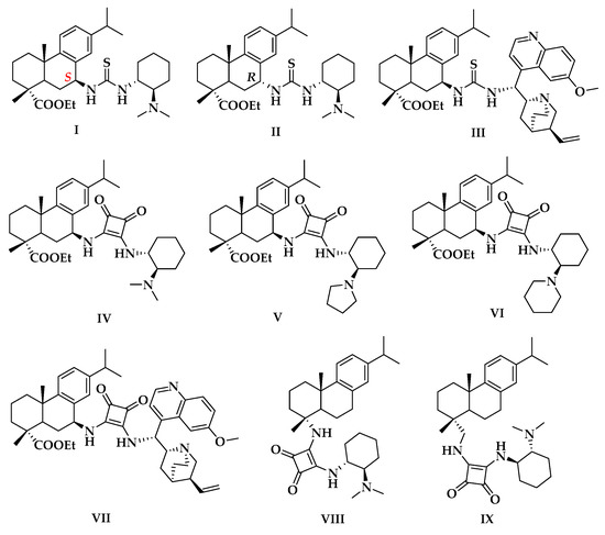 - Jiang, L.; Long, X.; Huang, W.; Lin, N.; Jiang, C.; Lu, G. Synthesis and characterization of chiral ethyl 7-amino-dehydroabietate. Fine Chem. 2014, 31, 807–811. [Google Scholar]