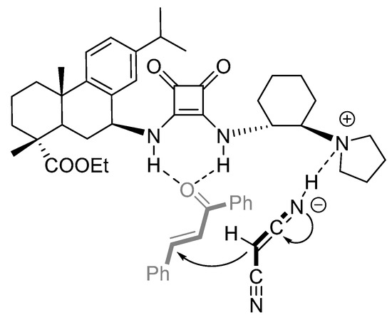 Based on literature reports [25,26,27,43] and the predominant R-configured product 4a, the feasible activation model for the asymmetric Michael reaction was proposed via cooperative catalysis of the squaramide functionality and the tertiary amino group of the rosin-derived squaramide V (Figure 3). The squaramide moiety activated trans-chalcone 3a through bidentate hydrogen bonds. Simultaneously, α-proton of malononitrile was captured by the basic tertiary nitrogen to form an active carbanion. Subsequent addition of the carbanion to the Si-face of 3a led to the desired adduct as major stereoisomer, which is in agreement with the observed experimental results.