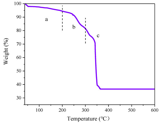 The thermal stability of MIL-101(Cr) is studied by the thermogravimetric analysis from 37 °C to 600 °C in air, and the results are shown in Figure 1. The material weight reduces by 5.6% below 200 °C in stage a, which results from the removal of physically and chemically adsorbed water at low temperatures. The loss observed at 200–300 °C is 13% in stage b, which indicated the removal of some hydroxyl groups and guest groups. In stage c (T > 300 °C), the loss of the weight increases, which indicates that the MIL-101(Cr) structure collapses, and the crystal form changes. Hence, the quasi-MIL-101(Cr) is the deligandation of the MIL-101(Cr), and this thermal stability could ensure the applicability of the catalyst over this temperature range in SCR. Figure S1 displays the thermogravimetric analysis of xCeO2/quasi-MIL-101 doped with different ceria content. It can be seen from the figure that the trend of the three samples is similar, and they restructured after 300 °C.
