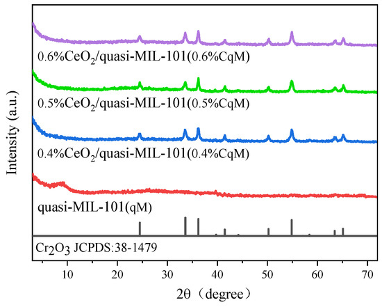 Preparation of xCeO2/quasi-MIL-101(Cr): By a double-solvent method, MIL-101(Cr) materials were placed in an n-hexane solution by ultrasonication for 1 h, and to make it uniformly dispersed. Different concentrations of Ce3+ solution (x = 0.4%, 0.5%, 0.6%) prepared by dissolving Ce (NO)3·6H2O in deionized water, were added to the mixture solution by vigorous stirring at room temperature for 3 h. The samples were dried at 200 °C for 12 h and calcined 300 °C for 2 h in a muffle furnace. For convenience, the resulting samples were labeled as xCeO2/quasi-MIL-101(Cr) materials, denoted as xCqM.