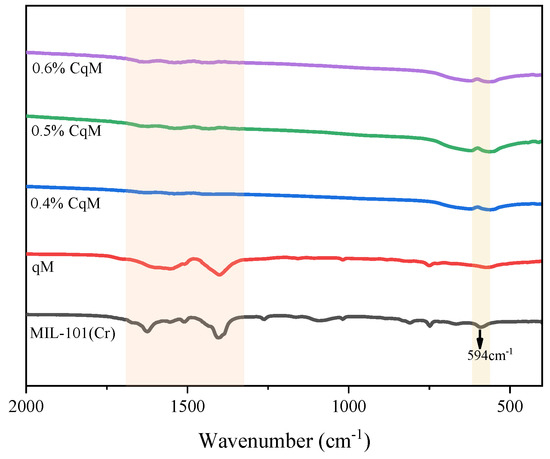 The diffraction peaks of MIL-101(Cr) are consistent with the published literature [53], as shown in Figure S2. XRD patterns of the quasi-MIL-101(Cr) and CeO2/quasi-MIL-101 catalysts with various amounts of deposited ceria being displayed in Figure 2. The quasi-MIL-101(Cr), broadening of the diffractions around 3–10° from MIL-101(Cr), is observed, which implies the partial deligandation of MIL-101(Cr) and carbon generation [47]. Due to the less Ce content, the XRD diffraction peak is not obvious [52,54]. However, ceria has a strong oxidation property. Under the same temperature of calcination, the oxidation rate of MIL-101(Cr) is enhanced, and more active sites are exposed. In addition, FT-IR spectroscopy of various samples is shown in Figure 3. FT-IR spectra of quasi-MIL-101(Cr) is almost the same as that of MIL-101(Cr). However, when the calcination temperature increases to 300 °C, the bands of carboxylates at 1630–1396 cm−1 broaden while the band of Cr-O at around 594 cm−1 indicates a red shift, which implies the partial deligandation of MIL-101(Cr). Moreover, a new broad band appears at 750–500 cm−1, belonging to Cr2O3 and CeO2. The original Cr-O bond disappearance may be due to the addition of Ce, which increases the oxidation performance of the catalyst. At the same temperature, partial deligandation phenomenon is aggravated, and the Cr-O bond is converted into Cr2O3 [47]. This is consistent with the XRD characterization.