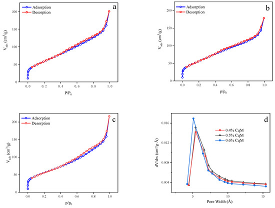 xCeO2/quasi-MIL-101 N2 adsorption-desorption isotherms and pore size distribution (a). 0.4%CeO2/quasi-MIL-101; (b) 0.5%CeO2/quasi-MIL-101; (c) 0.6%CeO2/quasi-MIL-101; (d) Median pore width distribution of xCeO2/quasi-MIL-101).