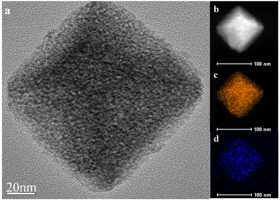 The SEM image of the MIL-101(Cr) is shown in Figure S4. The SEM pattern indicates that MIL-101(Cr) has an octahedral crystal structure. The TEM patterns of xCeO2/quasi-MIL-101 with various amounts of deposited ceria are displayed in Figure S5. According to the TEM images, it can be observed that the appearance of xCeO2/quasi-MIL-101 catalysts with different Ce content still has a regular octahedral structure. However, with the increase of the Ce content, it can be observed that the skeleton of the catalysts becomes to collapse, which is attributed to the strong oxidation property of Ce. At the same calcination temperature, the addition of Ce accelerates the oxidation of the catalyst and changes its skeleton. The TEM image of the 0.5%CeO2/quasi-MIL-101 is shown in Figure 5a. To reveal the elemental distribution on the 0.5%CeO2/quasi-MIL-101, High-angle annular dark field image-scanning transmission electron microscopy (HAADF STEM) image and EDS elemental mapping are performed, and the results are presented in Figure 5b–d. Figure 5b shows the HAADF STEM image of a single 0.5%CeO2/quasi-MIL-101. The EDS elemental mappings (Figure 5c,d) demonstrate the distributions of the Cr and Ce. Due to the strong oxidation ability of Ce, the surface of the original structure is rough and overlapped with the loaded Ce, which will affect the observation of Ce. Through Figure 5c, there are still some carbon skeletons and a large number of Cr elements, which is consistent with the previously reported literature [47]. Figure 5d shows that Ce is mainly dispersed in the framework, which is attributed to the preparation of the double solvent method [57].