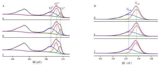(A) Cr 2p (a) 0.4%CqM (b) 0.5%CqM (c) 0.6%CqM; (B) O 1s (d) 0.4%CqM (e) 0.5%CqM (f) 0.6%CqM.