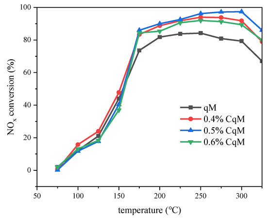 NOx conversions are displayed in Figure 7 for the quasi-MIL-101(Cr) and xCeO2/quasi-MIL-101 catalysts at low temperatures. All of the catalysts exhibit good catalytic activities at a temperature window ranging from 175 °C to 300 °C, and they fall after 300 °C. In particular, the conversion of NOx can be attained by 90% at 200 °C when xCeO2/quasi-MIL-101 is used as a catalyst. This fact fully demonstrates that the catalytic activity of xCeO2/quasi-MIL-101 is better than that of quasi-MIL-101(Cr) at low temperatures (<300 °C).