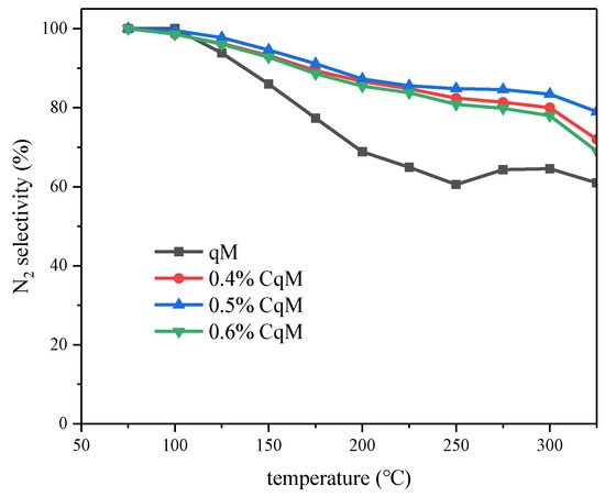 Figure 8 shows the selectivity of different catalysts for N2 during the SCR reaction. As the temperature increases, the selectivity of all catalysts decreases to various extents. Compared with the quasi-MIL-101(Cr) catalyst, the xCeO2/quasi-MIL-101 catalysts have higher N2 selectivity. Among them, the catalyst with 0.5% Ce has the best selectivity to N2. Similarly, excessive addition of Ce leads to the peroxidation of catalysts and decreases the selectivity to N2. The most intuitive performance is the transformation of the catalyst skeleton, which can be observed by FT-IR and TEM.
