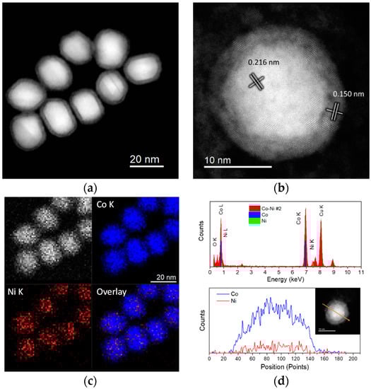 EDS analysis confirmed the presence of both Co and Ni elements within the nanoparticles, as shown from the EDS spectrum in Figure 2c. The estimated atomic composition was 92.7%Co–7.3%Ni, giving support to the presence of the HCP Co–Ni alloy. Additionally, an EDS line scan crossing at the center of an individual nanoparticle confirmed that Co and Ni are well distributed along the particle, as displayed in Figure 2d.