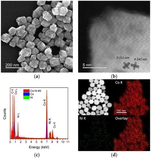 In the absence of 1,2-hexadecanediol, larger nanoparticles were obtained by using only OAm as the reducing agent, as shown in the SEM image provided in Figure 3a (Sample #3). The nanoparticles presented cubic and octahedral shapes having a highly faceted surface. The average size was 85 ± 13 nm. Figure 3b,c show an HAADF-STEM image of a single particle at atomic resolution. From the measured lattice distances of 0.242 and 0.211 nm, which formed an angle of ~55°, the particle was indexed as a Co1−xNixO FCC structure viewed along the [110] axis zone. The CoO-type phase crystallizes in a rock salt structure having the Fm3m space group, with a difference in the lattice parameters of ~2.3% between a CoO and NiO structure (a = 4.2667 Å for CoO, and a = 4.1684 Å for NiO). Hence, the measured distances between both structures suggest the formation of a Co1-xNixO solid solution. The EDS analysis from a large group of nanoparticles (e.g., the cluster shown in Figure 3d) confirmed the presence of Co, Ni, and O, as presented in the spectrum and mapping in Figure 3c,d. The estimated average composition from the acquired EDS spectra was 89.7%Co–10.3%Ni, indicating an atomic percentage ratio of 8.7 between the cations.