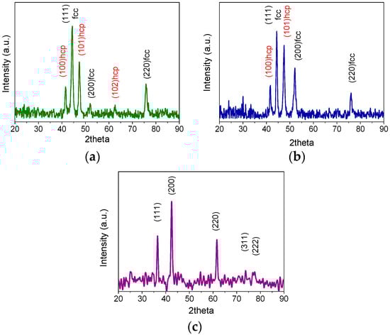 To better determine the structure of the synthesized particles, the freshly prepared powders were characterized by XRD. Figure 4 shows the diffraction patterns of the Co–Ni alloy nanoparticles (Sample #1, #2, and #3). In Figure 4a,b, corresponding to the colloidal preparation method of Samples #1 and #2, the characteristic peaks of metallic nickel FCC (ICSD 518120) and metallic cobalt HCP (ICSD 15288) were taken as references. As shown, both patterns present similar features with peaks located at 44.5, 51.8, and 76.4° assigned to the (111), (200), and (220) planes of the FCC structure, with additional peaks at 41.7, 44.3, 62.6, and 76.1° assigned to the HCP phase of cobalt. The observed peaks presented a slight shift with respect to the reference; this is associated with the alloyed Co–Ni, indicating the coexistence of both FCC and HCP phases of cobalt within the samples [,]. Meanwhile, the XRD pattern of the colloidally prepared Sample #3 confirmed the oxidized nature of the nanoparticles, Figure 4c. The pattern is indexed as a CoO-type structure, confirming the Co1-xNixO FCC solid solution phase.