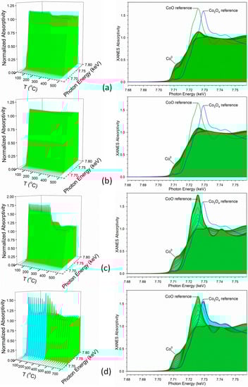 H2-TPR-EXAFS spectra near the Co K-edge of samples (a) #1, (b) #2, (c) #3, and (d) #4. (Cyan) is reduction of Co3O4 to CoO, and (Green) is reduction of CoO to Co0.