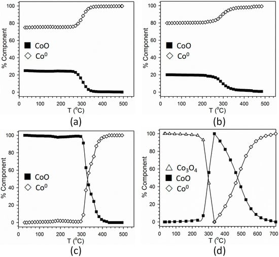 Linear combination fittings of H2 TPR-XANES spectra of Samples (a) #1, (b) #2, (c) #3, and (d) #4. The reference compounds for Samples #1–3 were the first spectrum of Sample #3 (representing 100% Co2+) and the final spectrum of each sample after remaining at 500 °C in H2 (representing ~100% Co0). Reference compounds for Sample #4 were the initial spectrum (representing a mixture of Co2+ and Co3+ similar to Co3O4), the point of maximum CoO content, and the final spectrum following TPR and holding (representing Co0). Note difference in scale for (d).