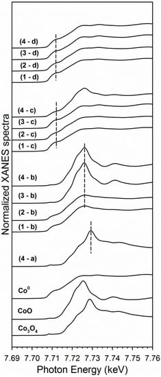 For sample designations, please refer to the Materials and Methods Section. Figure 5 displays hydrogen TPR-XANES spectra at the Co K-edge of the different samples. Figure 5a,b reveal that the nanoparticles prepared by the non-conventional method (Samples #1 and 2) start as a mixture of Co2+ and Co0, and the spectra resemble a mixture of CoO and Co0, while that of Figure 5c corresponding to Sample #3 begins entirely in the Co2+ oxidation state, resembling CoO. As shown by the linear combination (LC) fittings of TPR-XANES spectra with reference compounds in Figure 6a,b, both Samples #1 and #2 started with high Co0 content (75% and 80%, respectively), and achieved nearly complete reduction by 350 °C. Sample #3, as shown in Figure 6c, achieved nearly complete reduction from CoO to Co0 by 400 °C. The point of 50% reduction of CoO to Co0 occurred at ~330 °C.