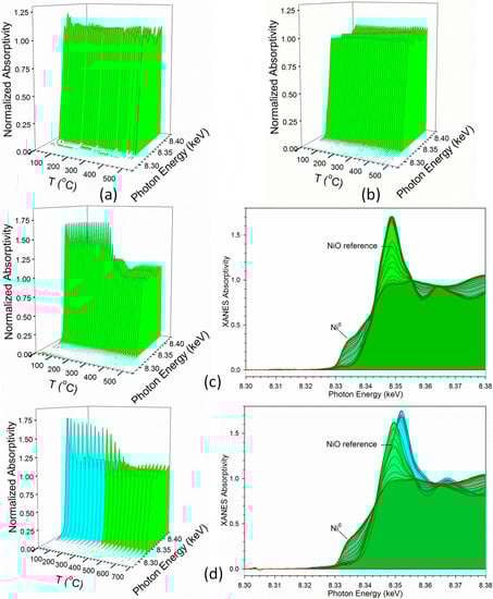 H2-TPR-XANES spectra at the Ni K-edge of samples (a) #1, (b) #2, (c) #3, and (d) #4. (Cyan) is Ni2+ (e.g., NiO) associated with cobalt oxides during reduction of Co3O4 to CoO. (Green) is reduction of Ni2+ to Ni0 when NiO reduction is associated with CoO reduction to Co0.