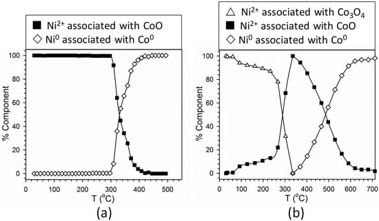 Linear combination fittings of H2-TPR-XANES spectra of Samples (a) #3 and (b) #4. Reference compounds for Samples #3 were the first spectrum (Ni2+ associated with CoO) and the final spectrum after remaining at 500 °C in H2 (representing ~100% Ni0). Reference compounds for Samples #4 were the first spectrum (Ni2+ associated with Co3O4), the spectrum for Ni2+ associated with maximum CoO content, and the final spectrum after H2 TPR (representing ~100% Ni0).