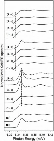 XANES snapshots at the Ni K-edge of reference compounds, and (a) the point of maximum NiO content in the H2 TPR-XANES run, and (b) the point at 500 °C, and (c) the point of maximum Ni0 content in the H2 TPR-XANES run for each catalyst sample (following ramping and holding at Tmax), including (1) Sample #1, (2), Sample #2, (3) Sample #3, and (4) Sample #4. Note that Samples #1 and #2 displayed very little NiO even in the initial spectra (compare 1a with 1c and compare 2a with 2c; they are very similar). Spectrum 4a: (Solid line) initial spectrum-NiO associated with Co3O4; (dashed line) spectrum at 335 °C-NiO associated with CoO.