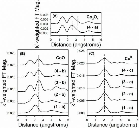 EXAFS snapshots near the Co K-edge of reference compounds, and (A) the point of maximum Co3O4 content, a, in the H2 TPR-XANES run, (B) the point of maximum CoO content, b, in the H2 TPR-XANES run, and (C) the point of maximum Co0 content, c, in the H2 TPR-XANES run after the hold at Tmax, for each catalyst sample, including (1) Sample #1, (2), Sample #2, (3) Sample #3, and (4) Sample #4. Note that only Sample #4 displayed Co3O4 content (i.e., in the initial period). Dashed lines denote Co–Co coordination in the oxides and metallic state, while the lower distance peak in (top) and (left) spectra at ~1.2 angstroms represents Co–O coordination.