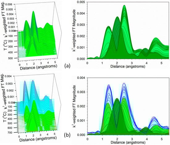 TPR-EXAFS data at the Ni K-edge are provided in Figure 13. For Samples #1 and #2, the Ni was significantly reduced at the outset and these spectra are not provided (see Figure 10 left) moreover, there was significant noise in Sample #1 during much of the TPR. Figure 13a,b of Samples #3 and #4, respectively, starts with peaks of Ni–O (low distance) and Ni–Ni (higher distance) consistent with NiO and then the peak for Ni–Ni for the metal starts to develop by ~325 °C for Sample #3 and ~500 °C for Sample #4, respectively. These are similar temperatures to those of the development of the Co-Co metallic coordination peak, once again suggesting intimate contact between Co and Ni in the catalyst samples. For Sample #4, the cyan spectra denote where Ni2+ is associated with Co3O4 reduction to CoO and the light green spectra denote where Ni2+ is associated with CoO reduction to Co0. Dark green spectra indicate significant Co–Co metal coordination.