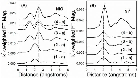 EXAFS snapshots near the Ni K-edge of reference compounds, (A) the point of maximum NiO content, a, in the H2 TPR-XANES run, and (B) the point of maximum Ni0 content, b, in the H2 TPR-XANES run, for each catalyst sample, including (1) Sample #1, (2), Sample #2, (3) Sample #3, and (4) Sample #4. Vertical dashed lines denote Ni–Ni coordination in the oxides and metallic state, while the lower distance peak in the left-hand spectra at ~1.2 angstroms represents Ni–O coordination. Spectrum 4a: (Solid line) initial spectrum-NiO associated with Co3O4; (dashed line) spectrum at 335 °C-NiO associated with CoO.