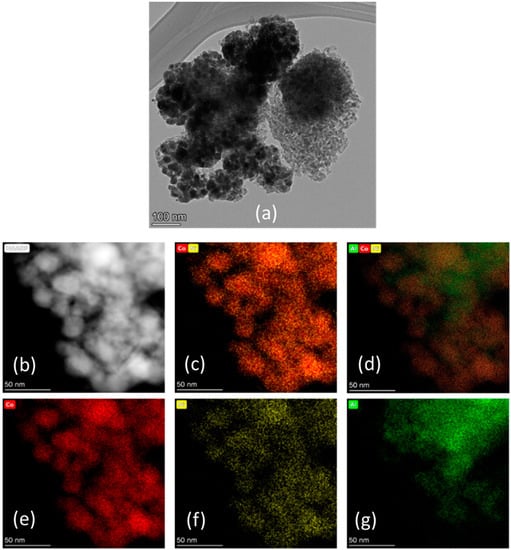 (a) TEM and (b) high-magnification HAADF-STEM image of Sample #4 with EDS maps. Elemental mapping legend: (c) cobalt and nickel, (d) aluminum, cobalt, and nickel, (e) cobalt, (f) nickel, and (g) aluminum. (Red) Cobalt, (Yellow) Nickel, and (Green) Aluminum.