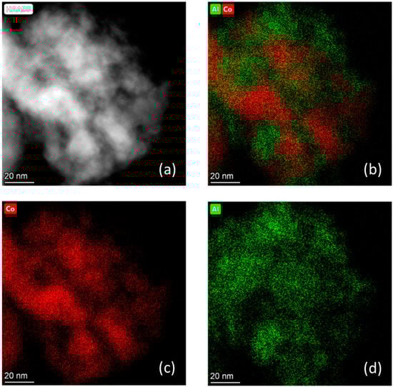 (a) High-magnification HAADF-STEM image of Sample #5 and EDS maps, including (b) aluminum and cobalt, (c) cobalt, and (d) aluminum. Elemental mapping legend: (Red) Cobalt and (Green) Aluminum.