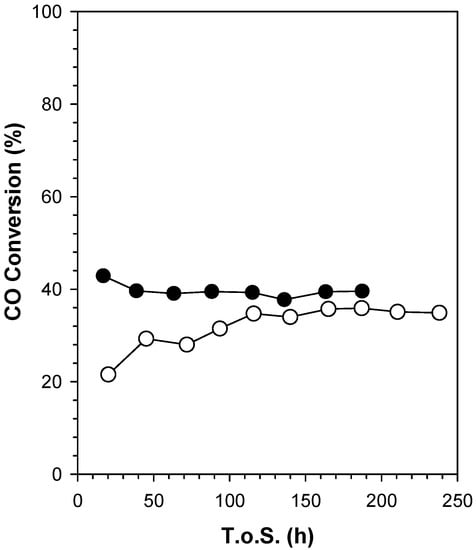 Evolution with T.o.S. of CO conversion for Sample #4 (open circle) and Sample #5 (filled circle), process conditions: T = 220 °C, P = 20.6 bar, H2/CO = 2 mol/mol, SV = 3.4 slph per gcat.