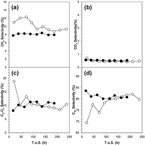 Evolution with T.o.S. of (a) CH4, (b) CO2, (c) C2-C4, and (d) C5+ selectivity for Sample #4 (open circle) and Sample #5 (filled circle), process conditions: T = 220 °C, P = 20.6 bar, H2/CO = 2 mol/mol, SV = 3.4 slph per gcat.