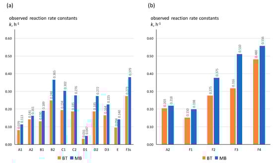 Due to the difference in the adsorption mechanism, more detailed kinetics of photocatalytic degradation of BT and MB was studied using Langmuir–Hinshelwood model (Equations (3) and (4)).