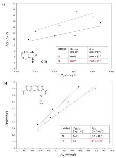 Langmuir isotherms for BT (a) and MB (b) adsorption on photocatalytic films A2 (R2 values were 0.9140 and 0.9761, respectively) and F4 (R2 values were 0.8522 and 0.9683, respectively); tentative binding and adsorption parameters are embedded in the graph (T = 23 ± 3 °C).