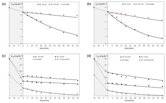 Kinetics of the photocatalytic degradation of BT (a,b) and MB (c,d) over irradiated films A2 and F4 in specially designed photoreactor. Grey areas denote the adsorption in the dark to achieve equilibrium.