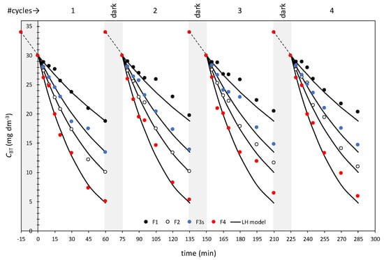 Note that the binding constant used in the kinetics model was the same as the one calculated from the adsorption isotherm, KL,i. The ka stands for the apparent reaction rate constant. This constant highly depends on the concentration of the pollutants on the surface and in the boundary layer, surface coverage (ϕ), catalysts optical properties such as specific absorption and scattering of the incident irradiation, and the intensity of the applied irradiation. The introduction of the term qSi in Equation (2) allowed the interpretation of the results independent from the irradiated surface, i.e., it allowed a more in-depth analysis. The idea of surface-related amounts instead of the adsorbed amount per mass of catalyst proven beneficial for a surface phenomenon such as thin-layer photocatalysis since given constants in applied Langmuir-Hinshelwood (LH) model is more significant. Kinetic parameters form LH (Langmuir-Hinshelwood) models are summarized in Table 2.