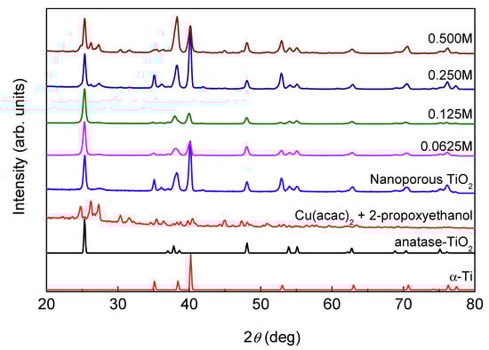 GIXRD diffractograms of unmodified nanoporous TiO2 and Cu-modified thin films are shown in Figure 5 along with calculated diffractions for anatase TiO2, hexagonal α-Ti (substrate) and measured organometallic copper compounds (Cu(acac)2 + 2-propoxyethanol) which were used as reference profiles. As can be seen, GIXRD discloses anatase TiO2 as the dominant phase present in all films. Cu-modified samples with a lower concentration of Cu-based compounds (0.0625 M and 0.125 M) have diffraction patterns similar to unmodified nanoporous TiO2, showing only peaks that can be attributed to TiO2. For the samples with a higher Cu concentration (0.250 M and 0.500 M), peaks that appear at 2θ around 24.7°, 26.1°, 27.3°, 30.4°, and 31.5°, can be attributed to an organometallic copper compound (Cu(acac)2 + 2-propoxyethanol). This result indicates that the drying of the modified samples for 1 h at 150 °C did not induce degradation of the used Cu-based compounds.