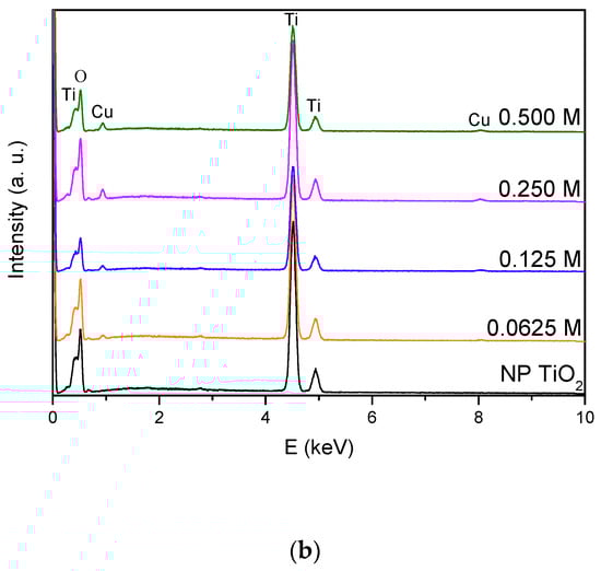 (a) Micrographs of the unmodified and Cu-modified NP TiO2 with various Cu concentrations (from 0.0625 to 0.500 M) and (b) qualitative EDS spectra of the given samples.