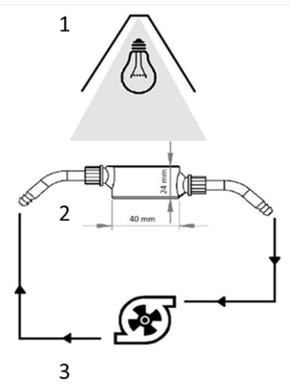 Schematics of the SPC: 1—irradiation source, 2—flow cell (V = 30 mL), and 3—peristaltic pump with hosing (Vtotal = 100 mL).