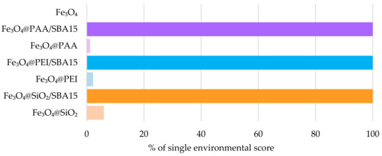 When analyzing the environmental profile of NPs considered to be Fenton catalysts, two distinct groups are observed: the stabilized magnetite NPs and those with a surface coating (Group 1); and those that have been immobilized in a mesoporous matrix (Group 2). It is evident that there are notable differences between the NPs belonging to one group and those belonging to the other, so that the environmental impacts associated with mesoporous NPs are excessively high in comparison with those produced with a simpler procedure. Accordingly, the high environmental impact of the Fe3O4 NPs onto the SBA-15 matrix can be explained attending to the use of additional chemicals needed to produce the mesoporous silica, as well as the electricity used during the heating stages required to carry out the reaction.