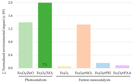 When reporting the results of nanoparticles used for photocatalysis, the environmental impact of Fe3O4/ZnO production show values comparable to those of silica-coated NPs, but there is a clear difference when assessing the impacts of Fe3O4/TiO2 nanocomposite, which implies a substantial increase in the normalized environmental impact up to 7.1·10−2 (Figure 2).