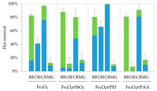 Percentage of dye adsorption (blue) and degradation (green) for C0 = 10 mg L−1 after 3 h of Fenton (300 mg L−1 of catalyst, 300 mg L−1 of H2O2, pH 3).