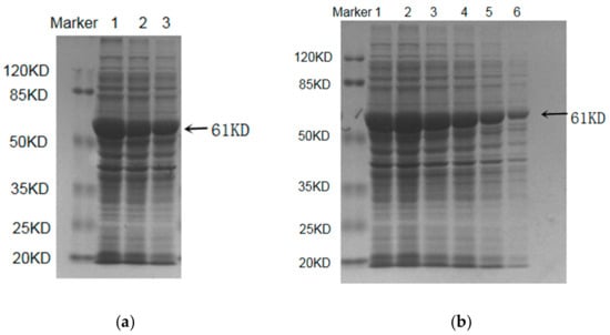 The induced expression of glutathione synthetase. (a) the effect of the different inducers. Lanes 1, 2, and 3 show GSH induced by Tianda No.1, lactose, and IPTG, respectively; (b) GSH at different low temperatures. Lanes 1–6 show the glutathione synthetase expression that was induced at 30 °C, 26 °C, 22 °C, 18 °C, 14 °C, and 10 °C, respectively, by the Tianda No. 1.