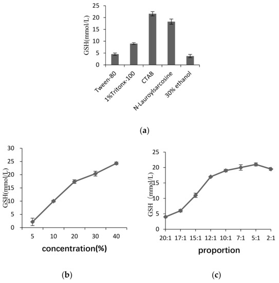 The effect of the permeability of yeast cells on GSH synthesis; (a) the effect of the different types of permeabilizing agents. The permeabilizing agents were Tween-80, 1% TritonX-100, CTAB, N-Lauroylsarcosine, and 30% ethanol; (b) the effect of the volume concentration of yeast cells. The yields are shown for the 100 mL reaction system with yeast cell volumes of 5%, 10%, 20%, 30%, and 40%; (c) the effect of the proportion of yeast to permeabilizing agent. The proportion of yeast to permeabilizing agent in the reaction system were 20:1, 15:1, 10:1, 5:1, and 2:1.