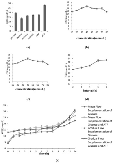 The initial concentration, supplemental concentration, supplementation time, and the supplementation strategy of glucose are all critical to the reaction system of GSH synthesis. To the initial reaction system, 10–80 mmol/L of glucose were added, which was then mainly catalyzed by the yeast endogenous enzyme. The effect of the initial glucose concentration on the GSH synthesis is shown in Figure 3b. The endogenous yeast enzyme catalyzes the first step reaction for about 10 h. Sufficient glutamyl-cysteine and ATP can be produced, which is most beneficial for the second step of the synthesis of glutathion catalyzed by the exogenous enzymes, as shown in Figure S1. After 10 h of reaction, CTAB was added to permeate the yeast cells. Next, 20–80 mmol/L of supplemental glucose was added for the reaction to continue to produce ATP. The effect of the supplemental glucose concentration on GSH synthesis is shown in Figure 3c. Glucose was added at 2 h, 3 h, 4 h, 5 h, and 6 h after permeabilization. The effect of the glucose supplementation time on GSH synthesis is shown in Figure 3d. Four strategies for replenishing energy were used, namely, mean flow supplementation of glucose, mean flow supplementation of glucose and ATP, gradual flow supplementation of glucose, and gradual flow supplementation of glucose and ATP. The effect of the different strategies of energy replenishment on the GSH synthesis is shown in Figure 3e. As seen from Figure 3a–e, the optimal concentration for the initial addition of glucose is 40 mmol/L. After using CTAB to permeate yeast cells, 30 mmol/L of glucose is added to synthesize more GSH at intervals of 5 h or 6 h. Before adding CTAB, the yeast cells mainly undergo the tricarboxylic acid cycle in the mitochondria to produce a large amount of ATP to synthesize GSH. Therefore, in the early stage of the reaction, the yeast cells consume less glucose, so a shorter glucose supplementation interval will lead to glucose accumulation, which will inhibit the synthesis of GSH [36]. The glucose can be fully consumed in 5 h or 6 h, and the energy can be replenished in time to promote GSH synthesis. Gradual flow supplementation is obviously superior to mean flow supplementation because it can better maintain the supply of energy and avoid excessive ATP in the system that would inhibit the synthesis of GSH. The combination with ATP is also superior to a single supplementation of glucose. Therefore, the gradual flow supplementation of glucose combined with ATP in the reaction system is more conducive to GSH synthesis.